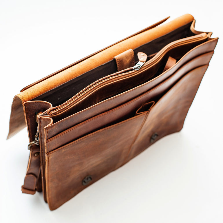 The Thomas Leather Briefcase boasts a wide zipper divider, a dedicated laptop sleeve, and slip compartments for documents and essentials, merging style with efficient design.
