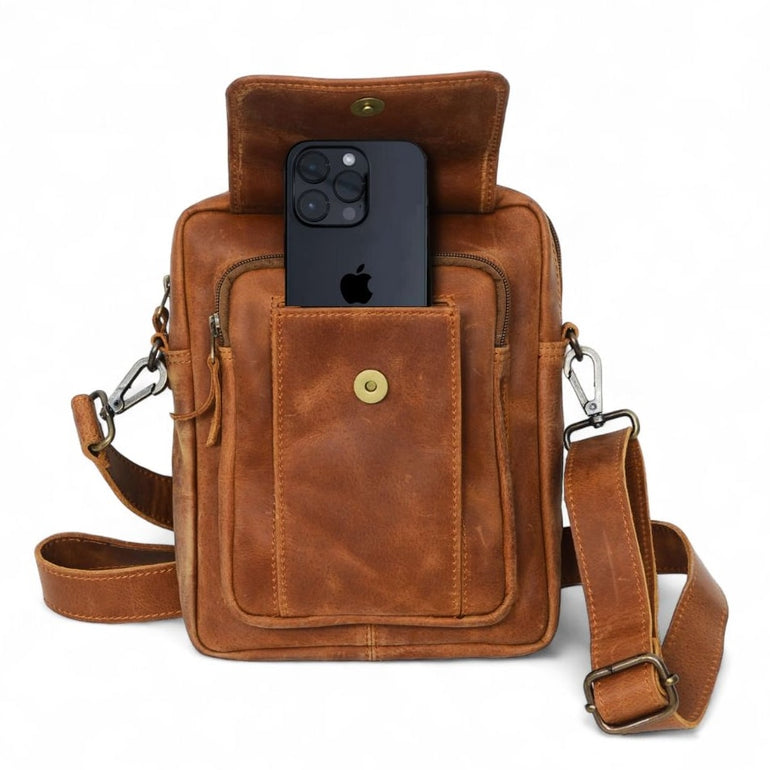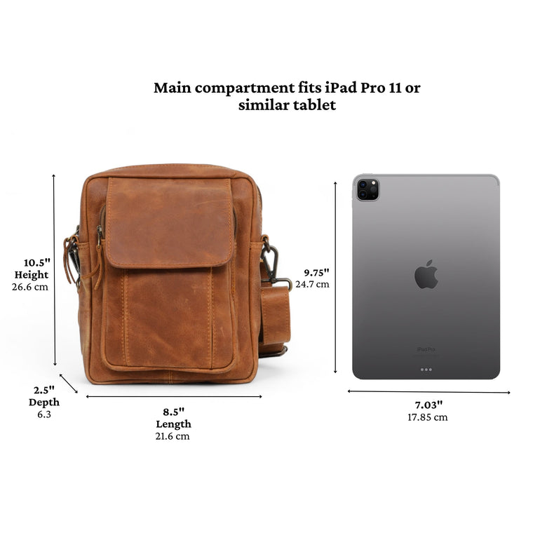 The Travel Leather Satchel, made from vegetable-tanned full-grain leather is a perfect grab-and-go travel bag. This crossbody bag is exclusively designed for travel, with room for a 11-inch iPad Pro. The font pocket is designed to fit an iPhone 15 Pro Max - It has enough space for all your travel essentials!