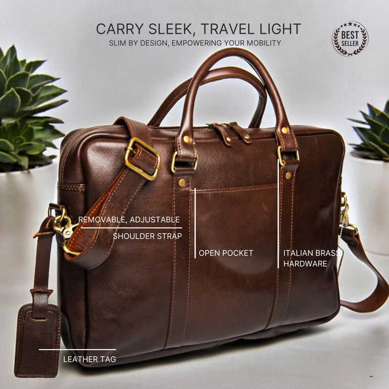 This full-grain leather briefcase offers streamlined design for effortless professionals.