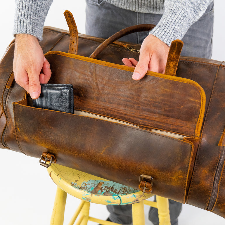 Discover the seamless functionality of our Alpha Leather Duffle's front pocket, perfect for your essentials on the move.