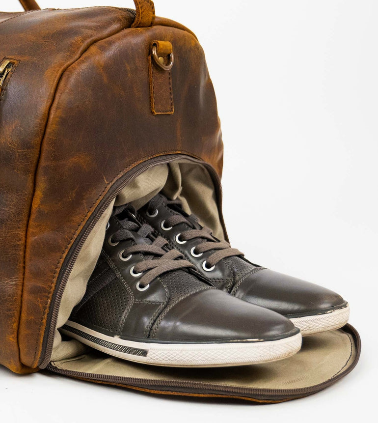Style meets organization with our Alpha Leather Duffle's shoe compartment.