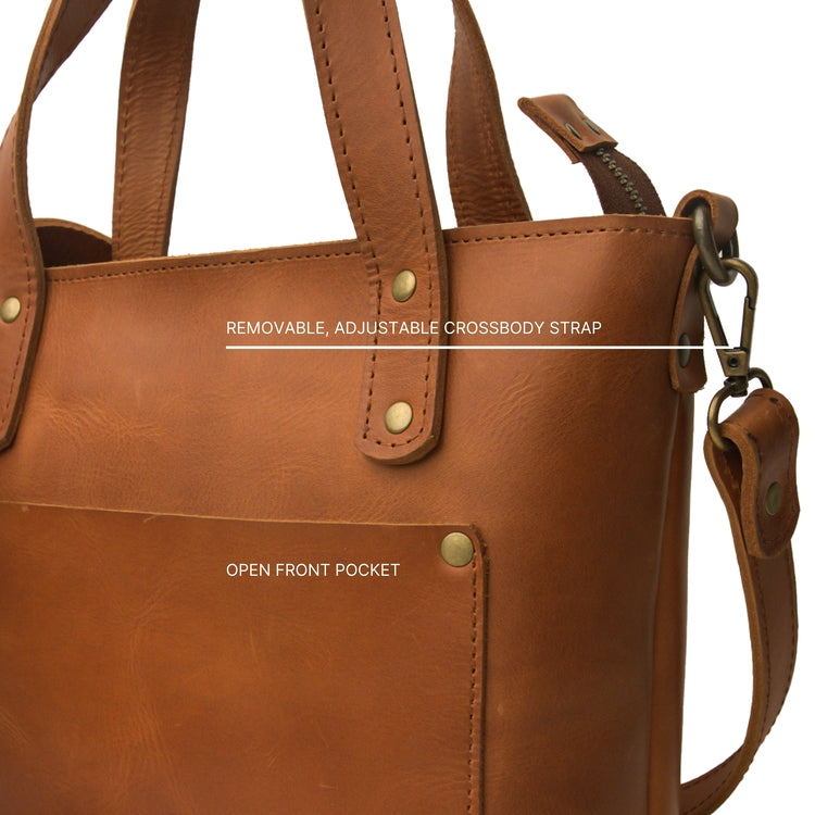 Meet the Leather Mini Tote – stylish and practical. Crafted from full-grain leather, this tote is ready to withstand daily use. Small but mighty, it features an unlined, simple design that exudes elegance. It comes with a removable, adjustable crossbody strap for versatile carrying options. Inside, there's a zipper pocket that comfortably fits an iPhone Pro Max. Available in five stunning colors, this Mini Tote is your ideal companion for any occasion.