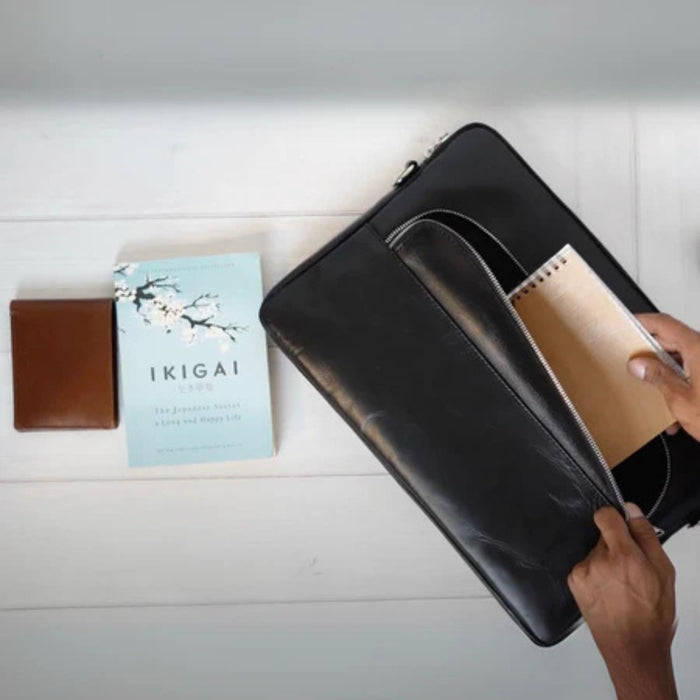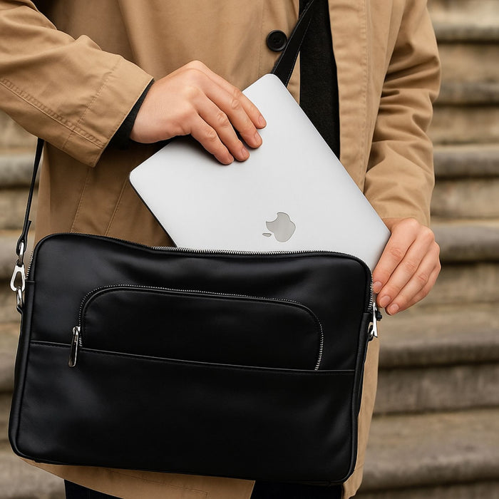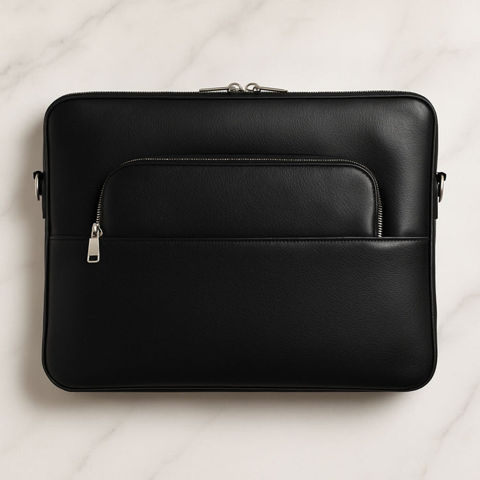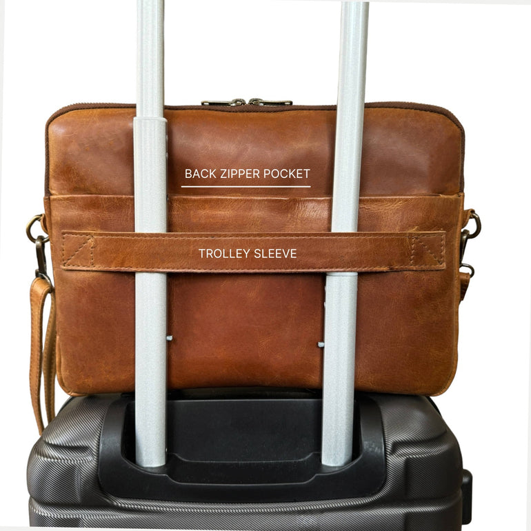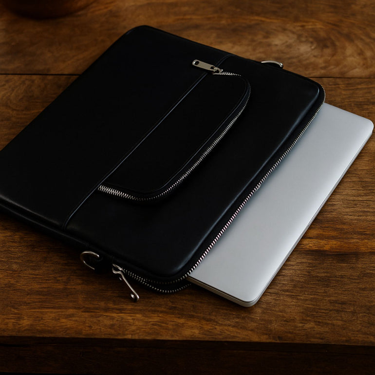 This premium tech leather laptop Sleeve, available in two sizes, fits 13/14" MacBook Pro and 13" MacBook Air (small) or 16" MacBook Pro and 15" MacBook Air (large). Featuring luxurious Italian hardware, a front zipper pocket for chargers and AirPods, a secure back zip pocket for passports, and a convenient trolley sleeve, it combines style and functionality for your tech essentials.