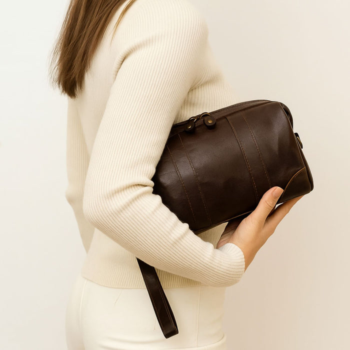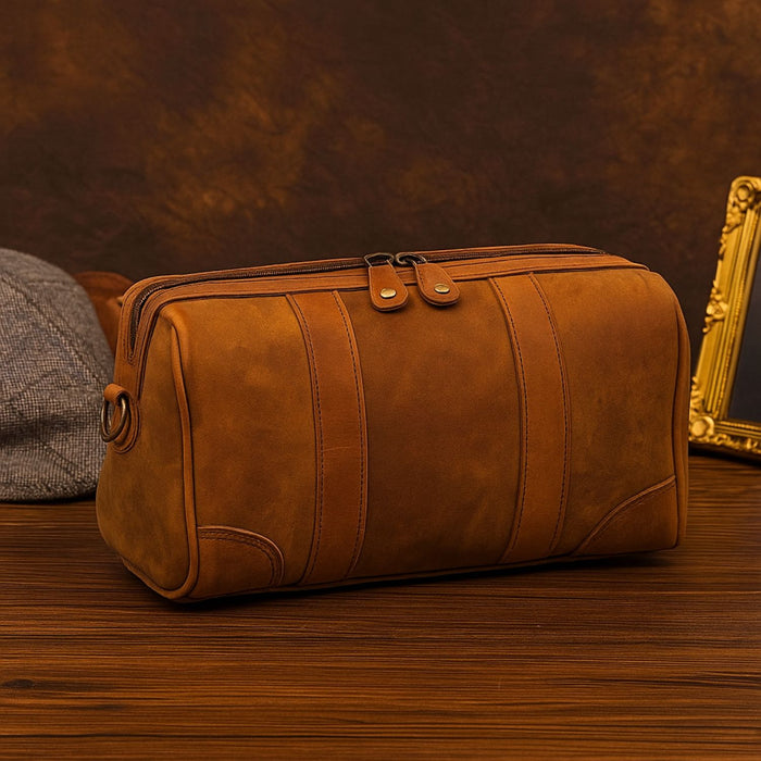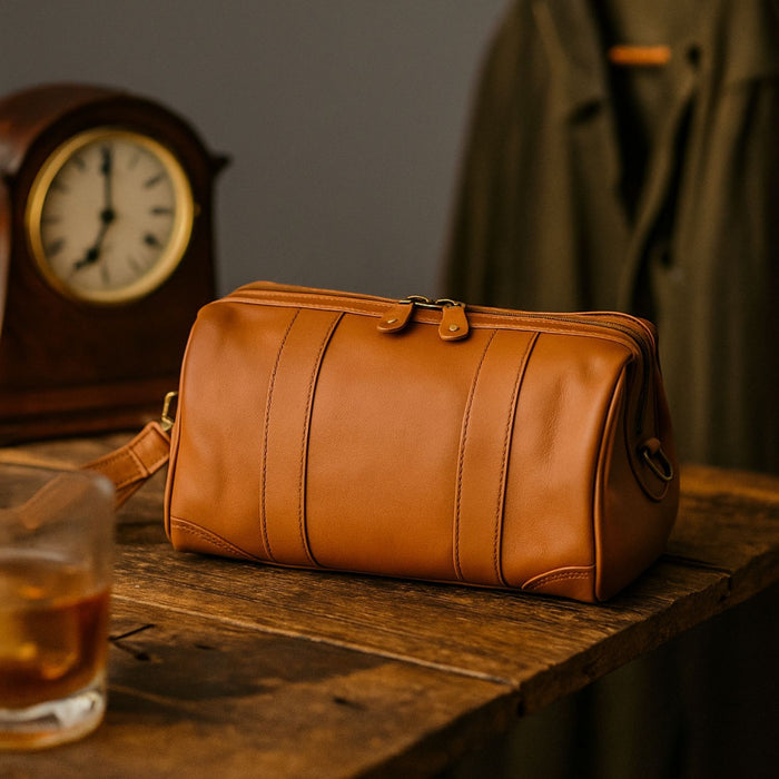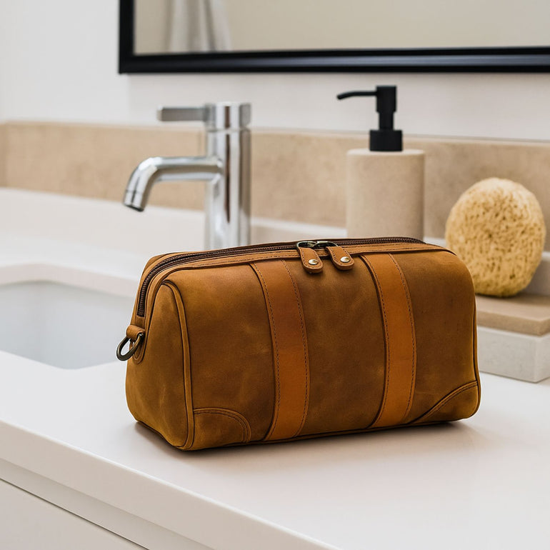 Handcrafted from vegetable-tanned full-grain leather, the Rasage Toiletry Kit offers a simple and classic design. Inside, a natural cotton lining and a main compartment with a zipper closure keep your items secure. The removable wristlet adds convenience. Lightweight and spacious, it's perfect for organizing grooming products and more.
