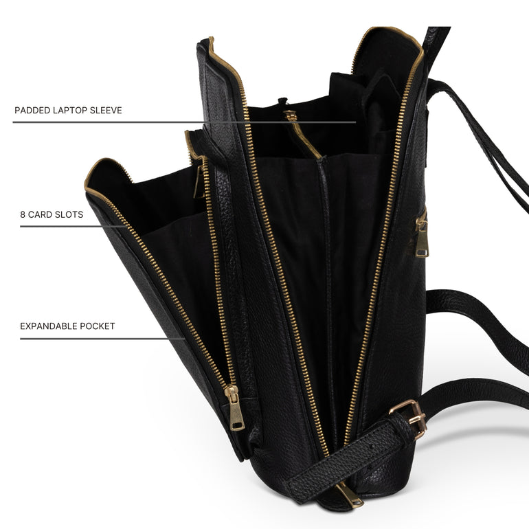 • Metal feet ensure the leather is protected when the backpack is placed down.